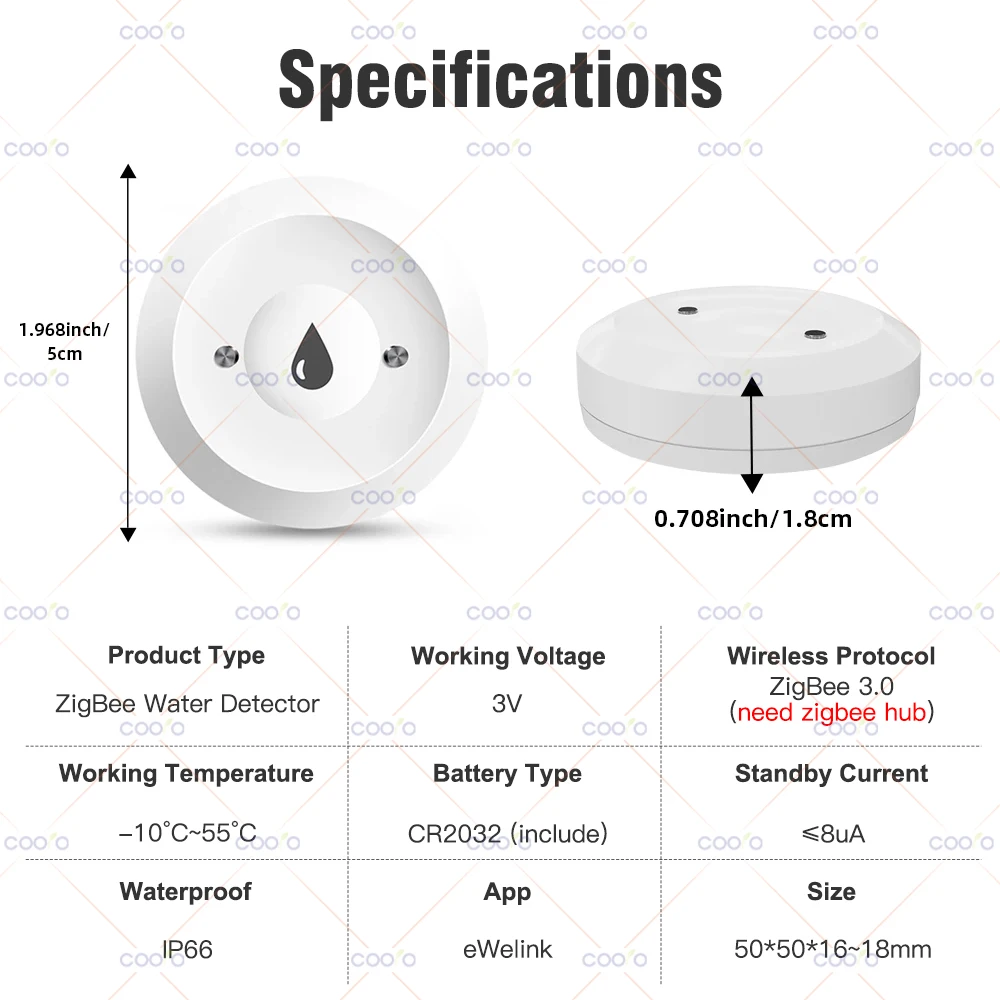 1) Zigbee3.0 Technology :The Ewelink Zigbee3.0 Water Sensor Alarm leverages the latest Zigbee3.0 technology, ensuring reliable and efficient communication with the Zigbee Gateway for real-time alerting.