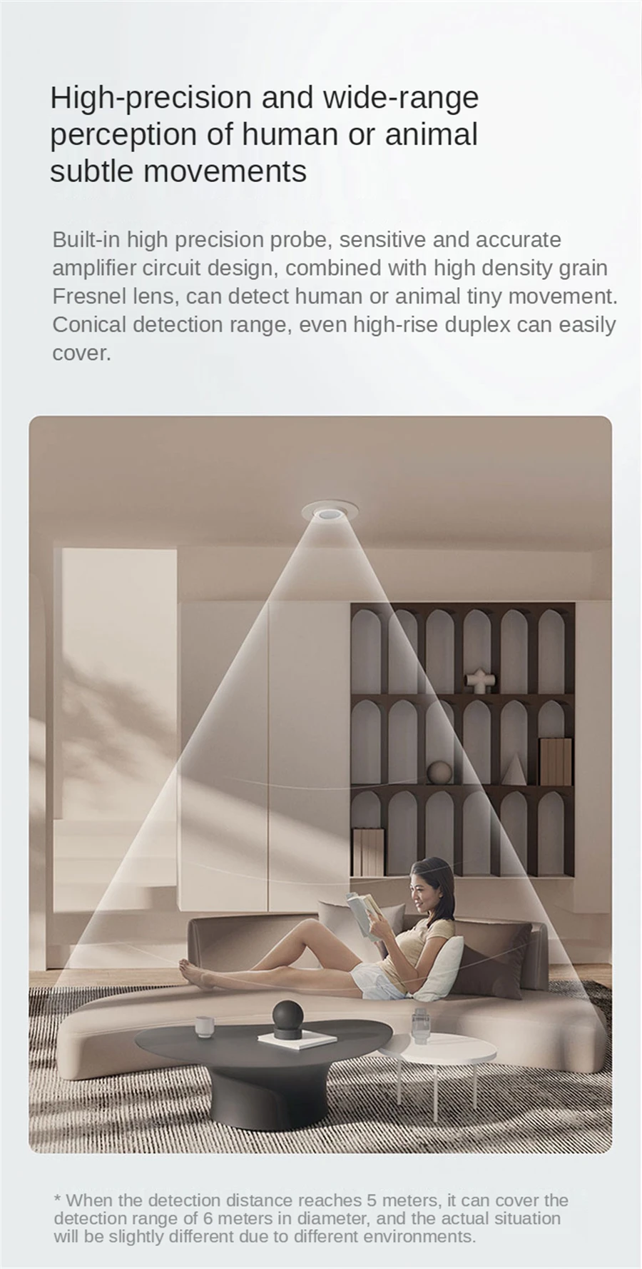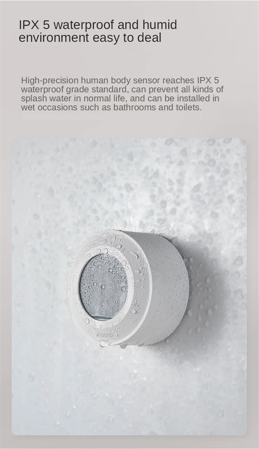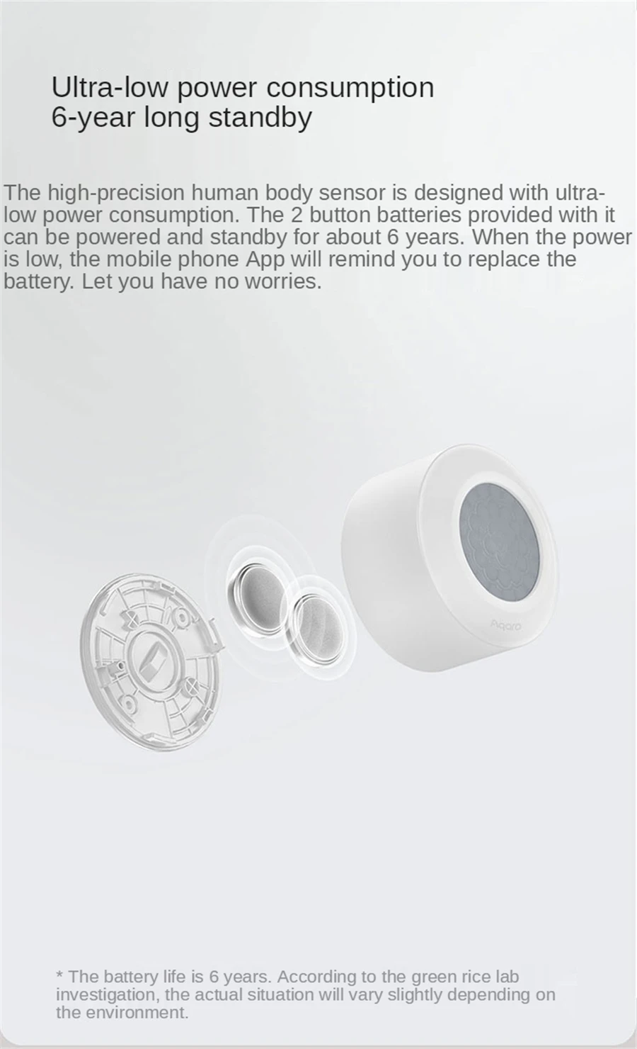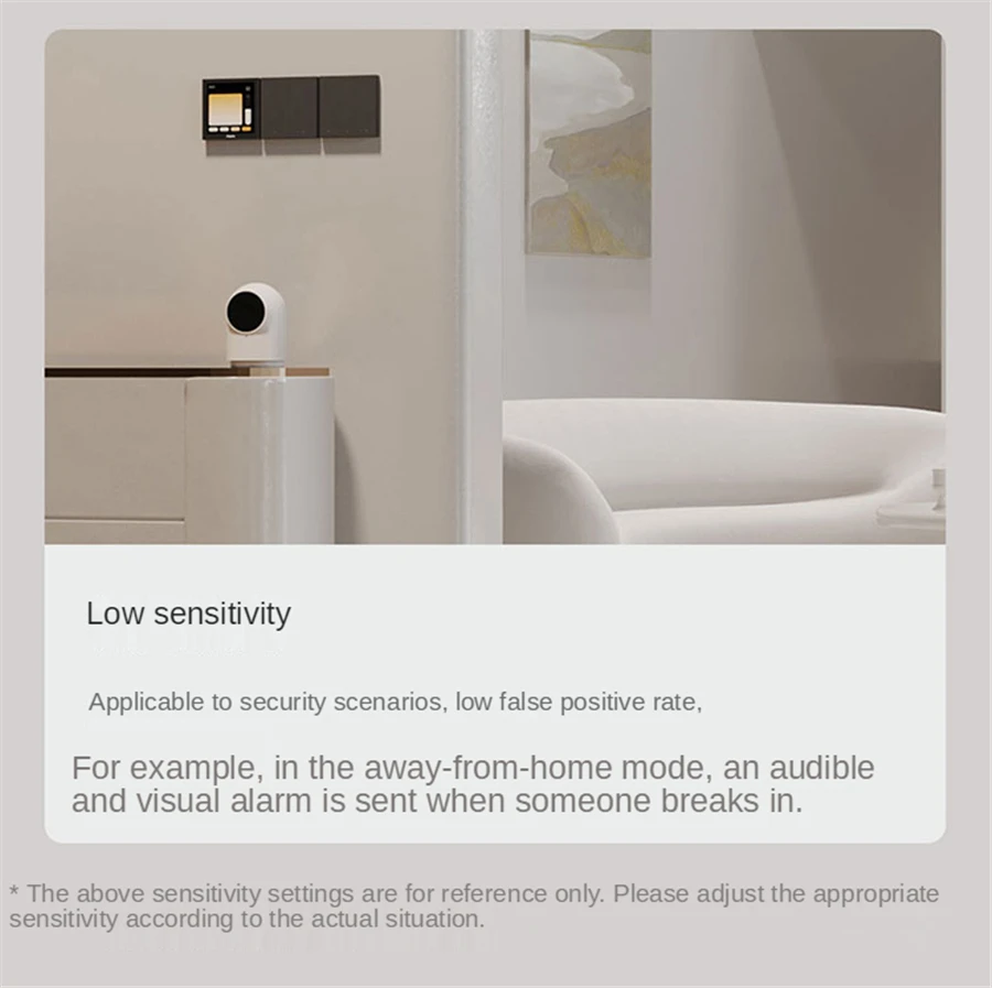 Basic Parameter Brand: Aqara Product model: RTCGQ13LM Product size :74 x 74 x 43.3mm Sleeve size :113 x 113 x 41mm Wireless connection to : Zigbee 3.0 Battery model: CR2450 Implement standard :Q/QLML002-2020 Operating temperature :-10°C-+35°C Operating humidity: 0 to 95%RH, non-condensing Detection distance: 5m The detection Angle is about: 60°conical Circle with a diameter of: 6m (at a distance of 5m)