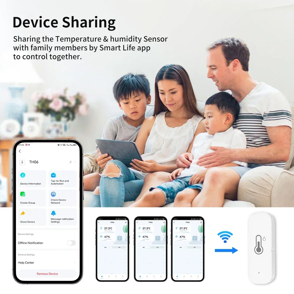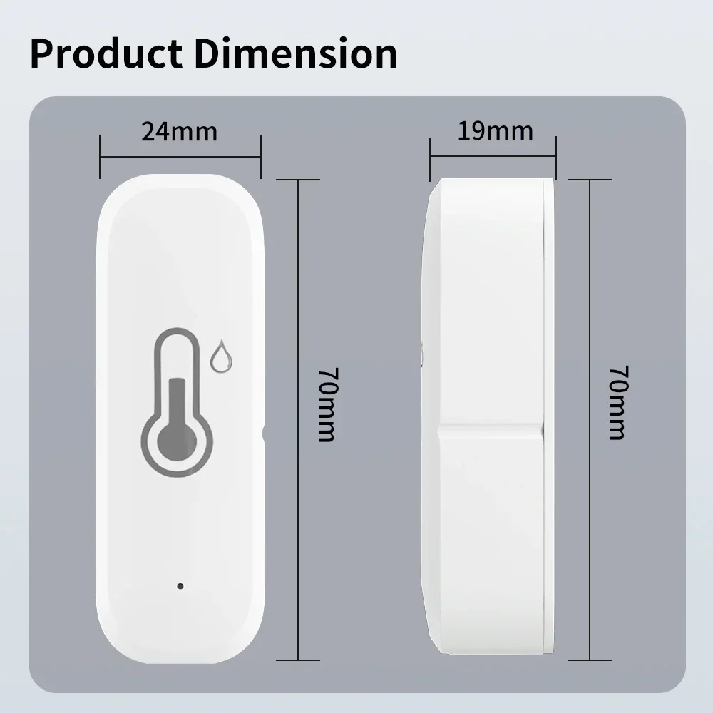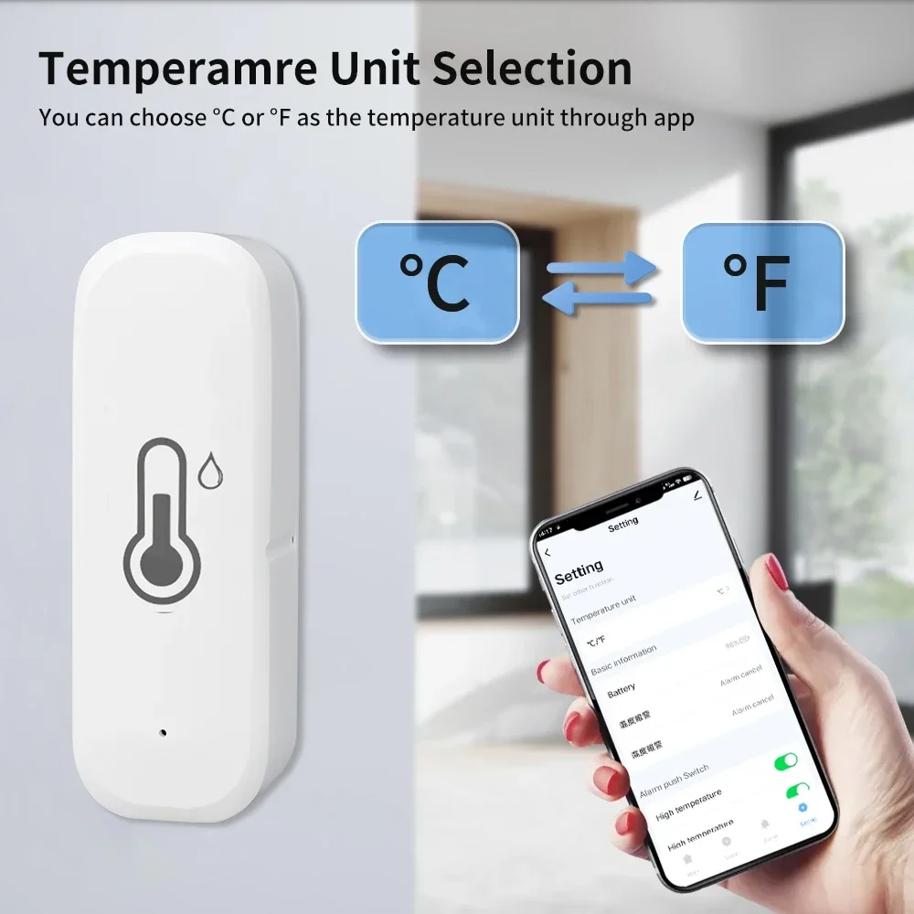 APP remote control View current temperature & humidity through and history Temperamre Unit Selection You can choose °C or °F as the temperature unit through app. Smart Linkage Function DIY different smart automation/tap to run scene Voice control Temperature and humidity information can be obtained at any time through Alexa or Google Home voice assistant. Device Sharing Sharing the Temperature & humidity Sensor with family members by tuya smart/Smart Life app to control together. Alarm management If the detected temperature/humidity value exceeds the set value, APP will receive an alarm notification message.