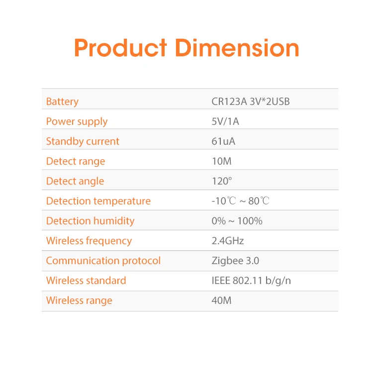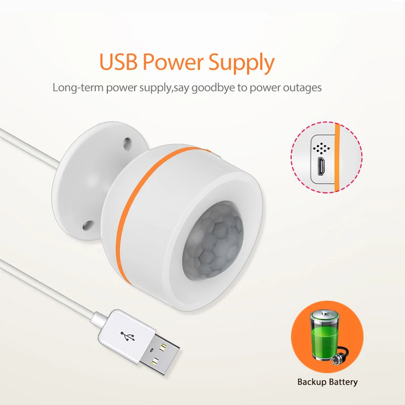 Battery Powered PIR Motion Sensor: - CR123A Battery Built-in - Support 5V 1A USB Port power - Non-rechargeable battery - Working Time: 2 Year ( Based on 10 events/day) - Standby Time: 3 Years - Standby current:13uA - Working current:65mA - Max current:100 mA