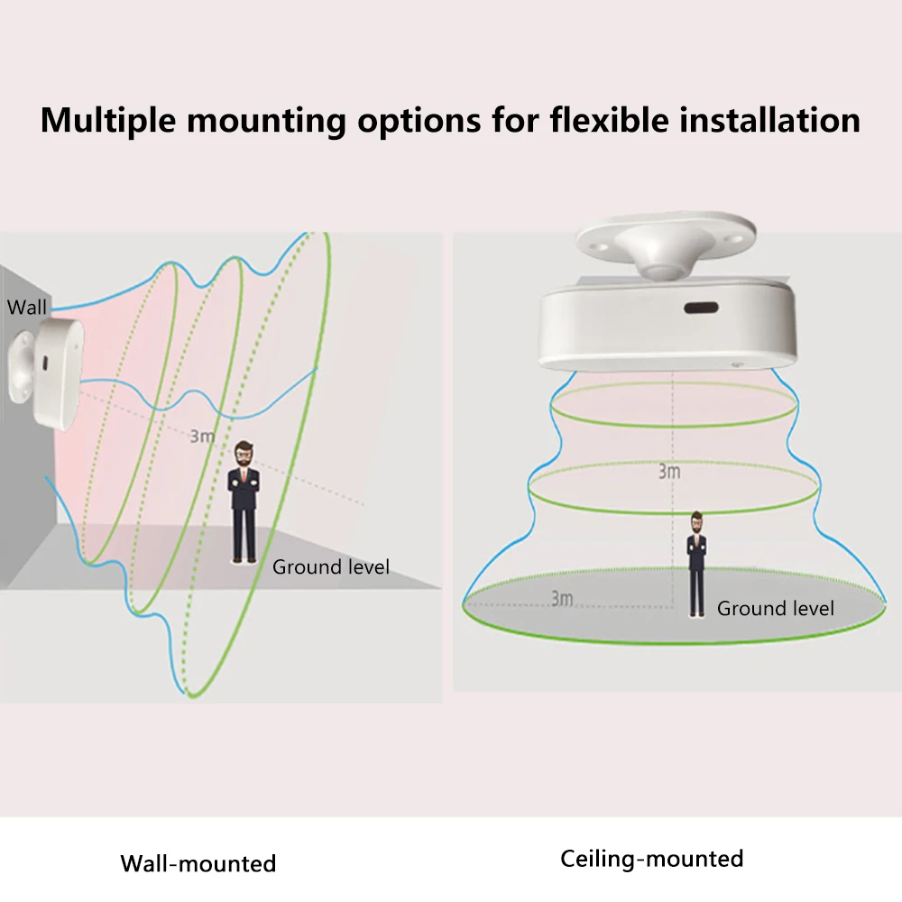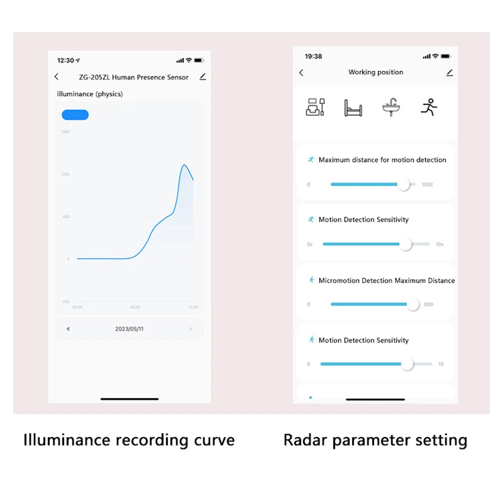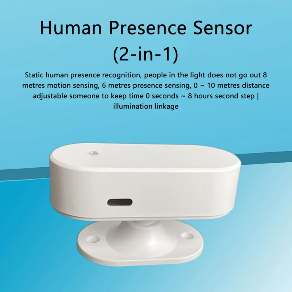 Features: 1.static human body recognition, automatic scene recognition, and anti false alarm processing 2.multiple induction recognition, supporting mobile, micro motion, heartbeat detection, high sensitivity detection, and ultra-low false alarms 3.the light recognition range is 0-2000lux, and the illuminance curve of the last 7 days can be checked, supporting intelligent linkage 4.adjustable distance of 4.0-10 meters, sensitivity adjustable for 0-10 levels, suitable for various scenarios 5.it can be paired with an omnidirectional bracket, wall mounted, with adhesive backing that can be easily applied, suitable for living rooms, study rooms, bedrooms, restrooms, corridors, etc