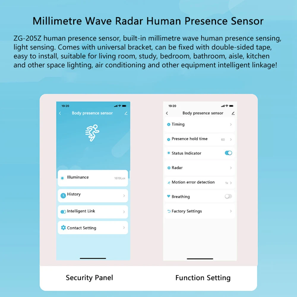 Parameters: Product name: Human presence sensor (radar+light sensing in one) Light sensitivity range: 0-2048lux Product model: zg-205z/b zg-205w/b (optional) Alarm volume:>110db Power input: dc5v/1a Working current: 500ma Static detection range: 0-600cm Mobile detection range: 0-1000cm Lighting value: 0-3000lux Millimeter wave: 5.8g/24g (optional) Working humidity: 10% -95% rh General protocol: zigbee3.0 (requires gateway)/wifi2.4g (optional) Working temperature: -20~60℃ Size: 72*32*38mm