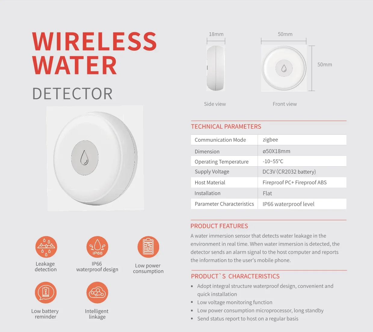 Yiweilian Smart Home Water Level Detector ZigBee Water Level Detector Intelligent Linkage 1. Detect water leakage. Mobile App remotely notifies and is compatible with the gateway. 2. Simple and convenient to use. 3. Supports IFTTT and other intelligent voice control. 4. Displays battery level, alarm management, and incident query. 5. Query historical records. 6. Mini portable size. Product size: 50X18mm Color box size: 85*95*50MM Number of items per box: 200 pieces per box Outer box size: 460*270*210MM Net weight of product: 40g Gross weight of product: 60g Gross weight of outer box: 12kg Packaging list: Water level detector * 1 Instruction manual * 1 The product cannot be used independently. It needs to be used in conjunction with the gateway. Please note!