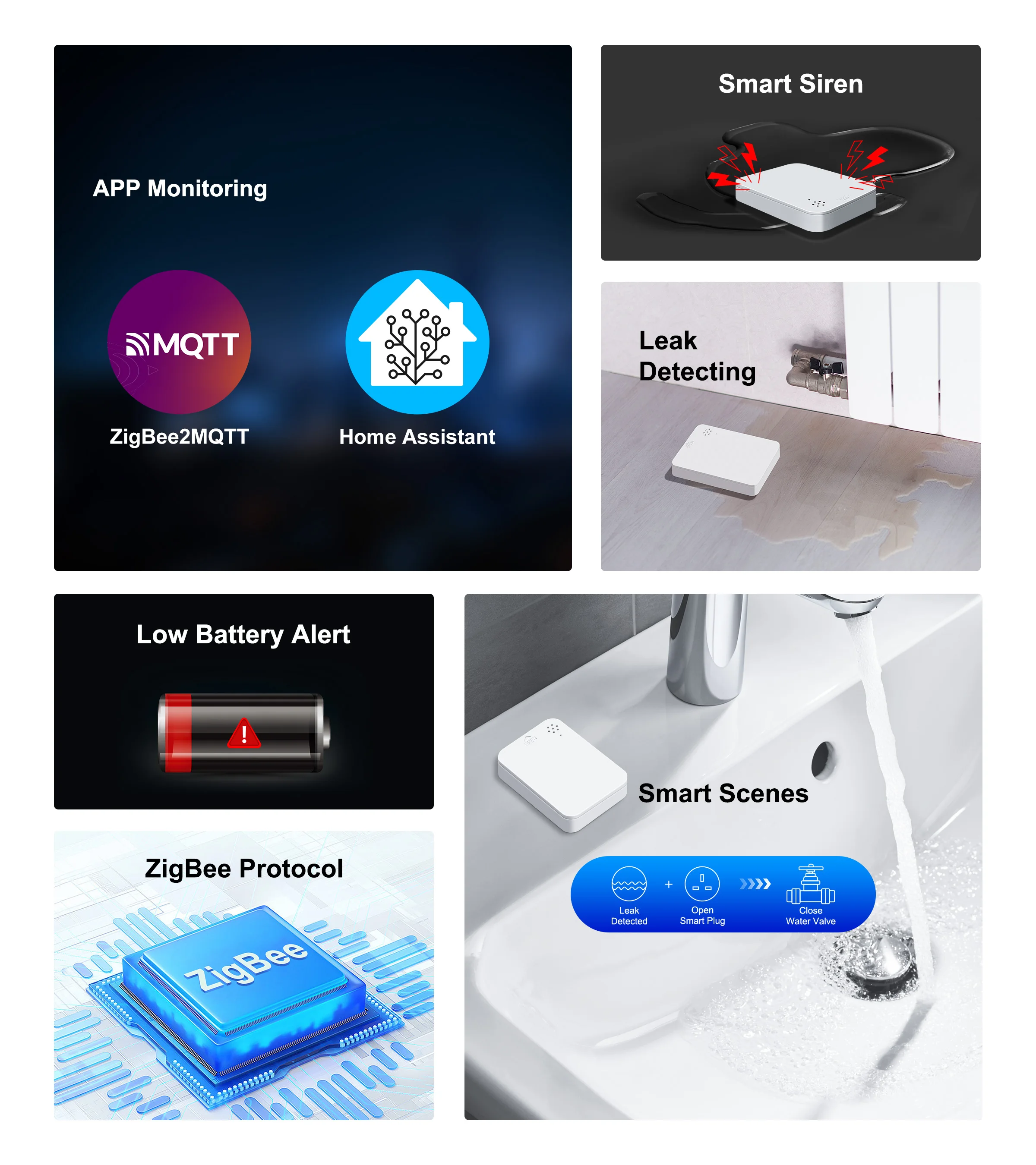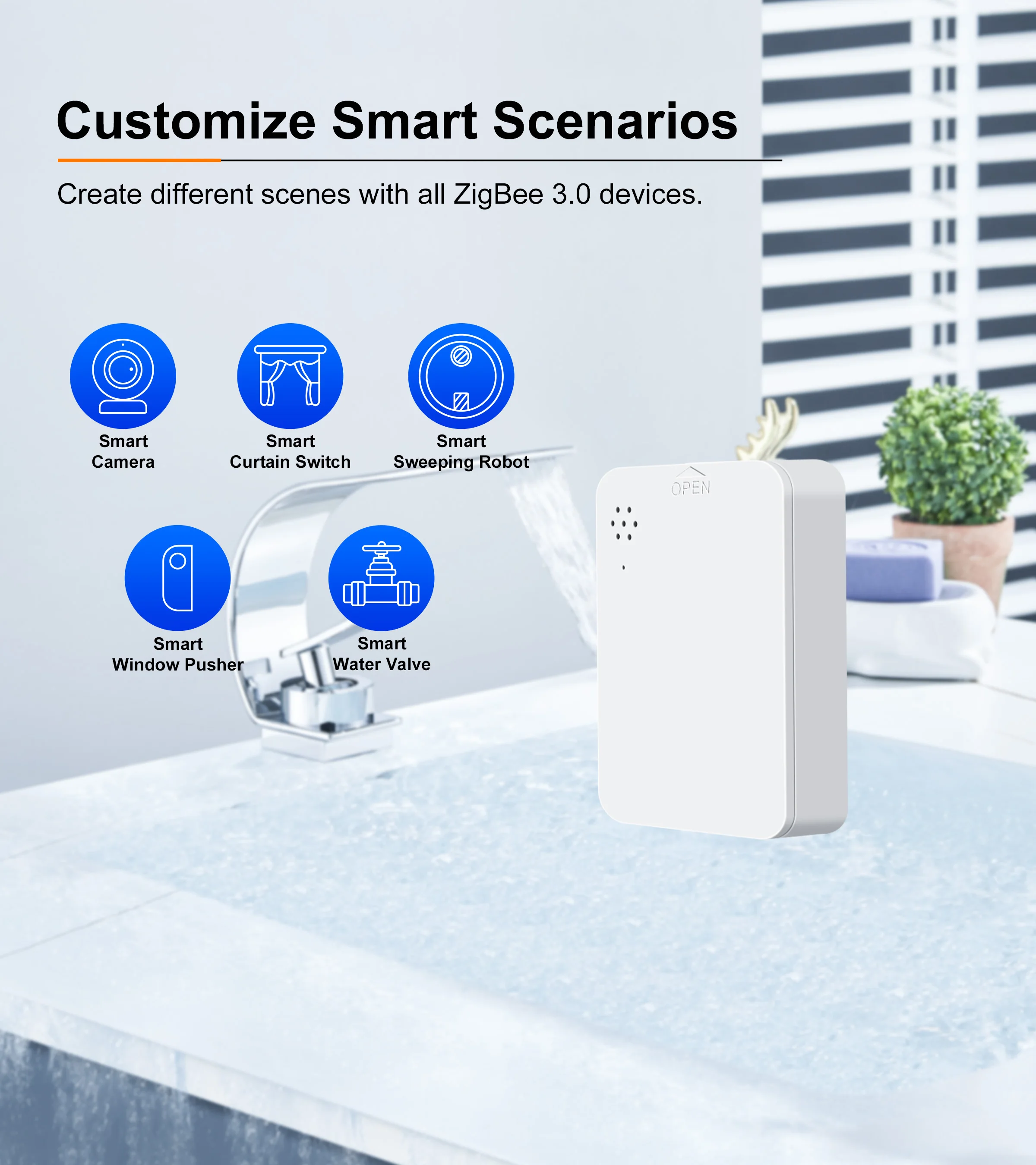 Integrate this smart water leakage sensor with other smart ZigBee 3.0 devices for seamlessly home automation. For instance, close the water valve in case of kitchen sink leaks or trigger window closure when water is detected on the windowsill.