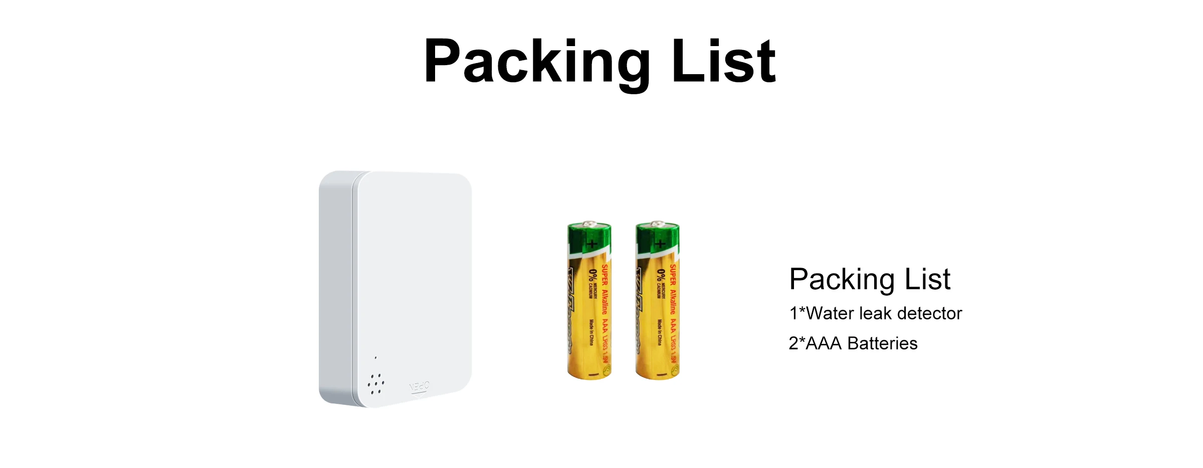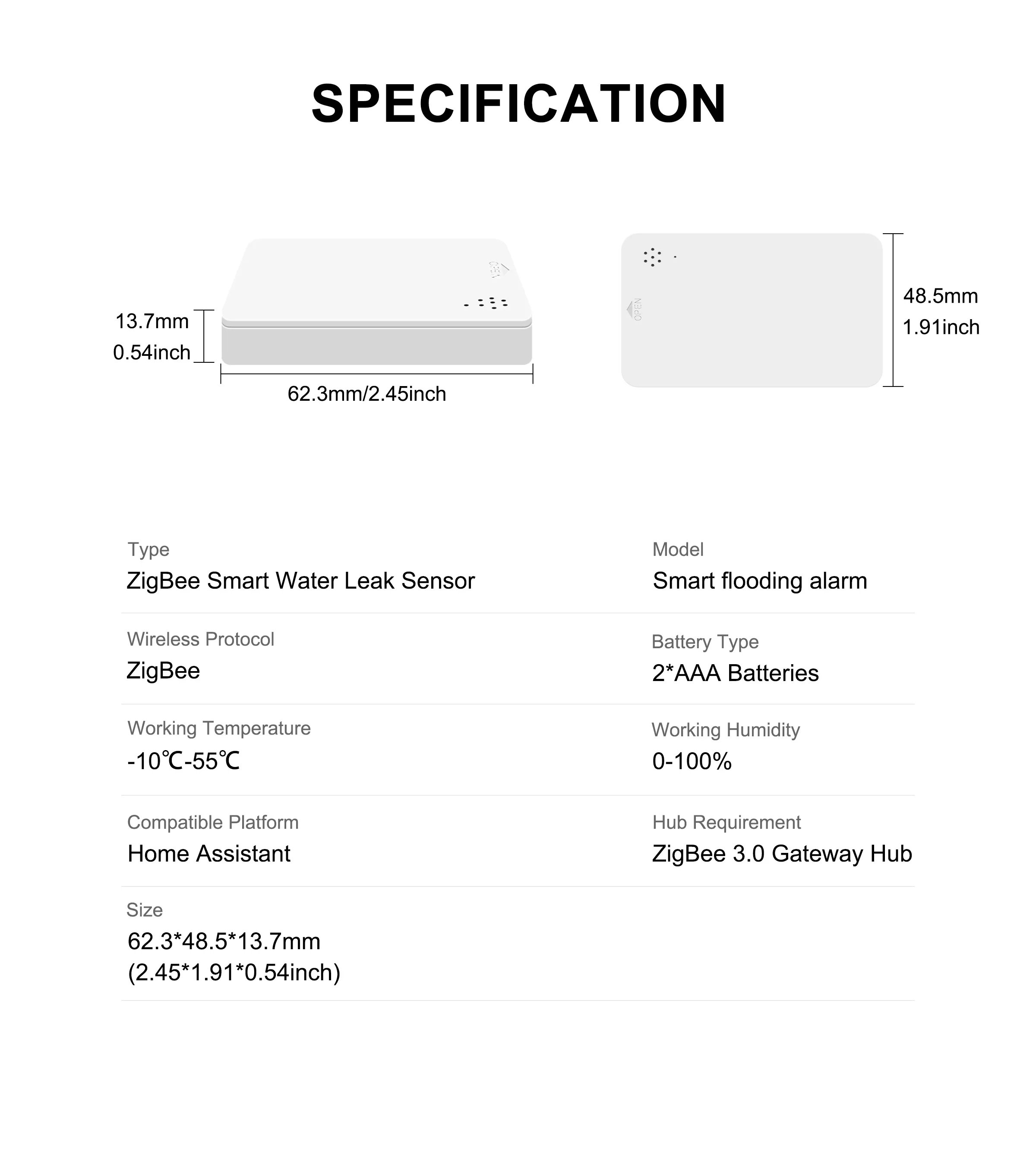 Type:ZigBee Smart Water Leakage Sensor Model: Smart Flooding Alarm Wireless Protocol: ZigBee Size: 62.5mm*49mm*14mm Battery Type:2*AAA Batteries Working Temperature: -10℃-55℃ Working Humidity: 0-100% Hub Requirement: Yes Alarm Sound: 80-85 dB